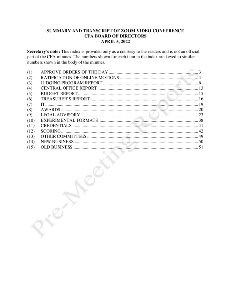 SUMMARY AND TRANSCRIPT OF ZOOM VIDEO CONFERENCE CFA BOARD OF DIRECTORS APRIL 5, 2022, Secretary's note: This index is provided only as a courtesy to the readers and is not an official part of the