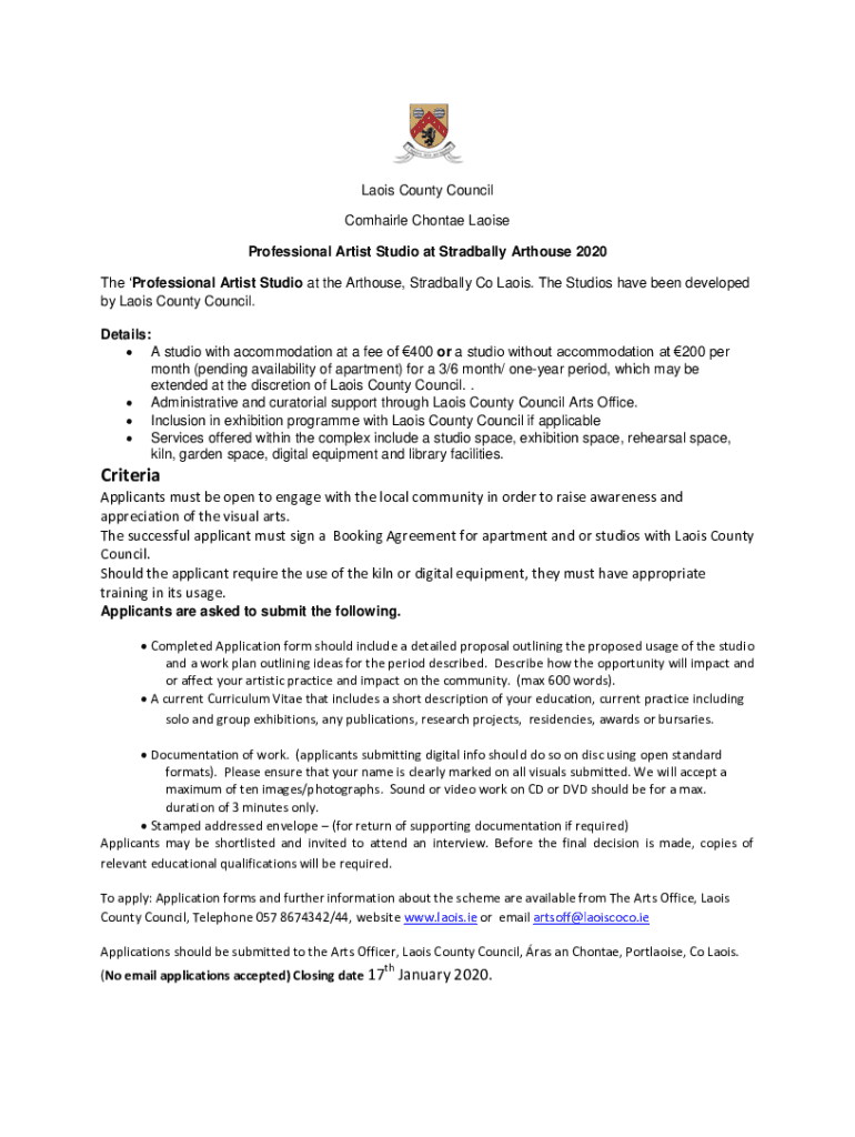 Anyone who wants to make use of the resources at Laois Arthouse needs to file Form Laois Arthouse and.