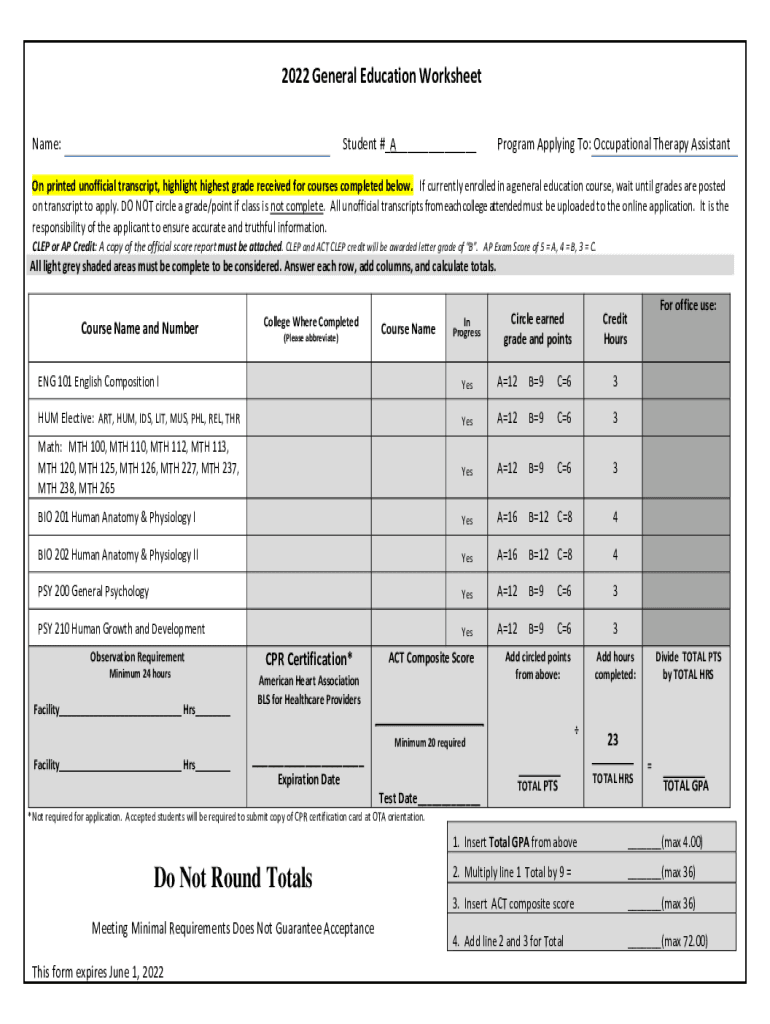 2022 General Education Worksheet Name:Student #_A___Program Applying To: Occupational Therapy Assistant printed unofficial transcript, highlight the highest grade received for courses completed below.