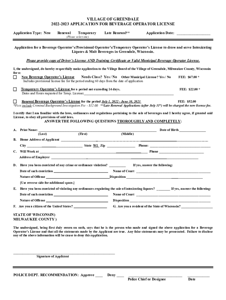 VILLAGE OF GREENDALE 20222023 APPLICATION FOR BEVERAGE OPERATOR LICENSE Application Type: NewRenewalTemporary(Please select one)Application Date: ___Late Renewal**Application for a Beverage Operators/Provisional