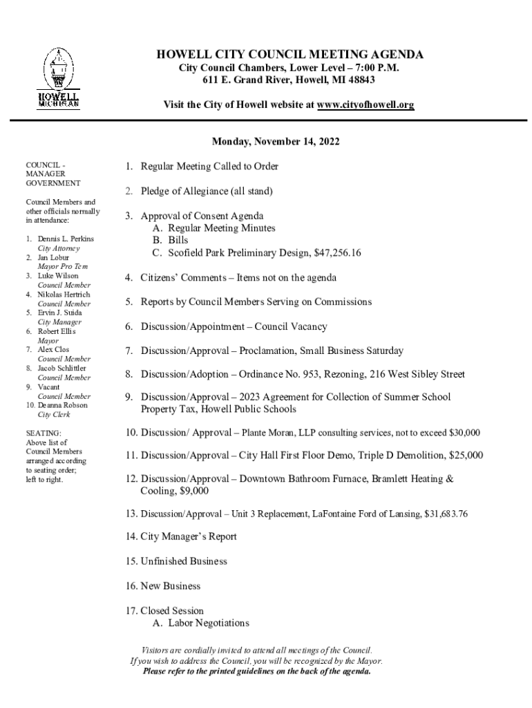 HOWELL CITY COUNCIL MEETING AGENDA City Council Chambers, Lower Level 7:00 P.M. 611 E. Grand River, Howell, MI 48843HOWELL MICHIGAN:Visit the City of Howell website at www.cityofhowell.org Monday,