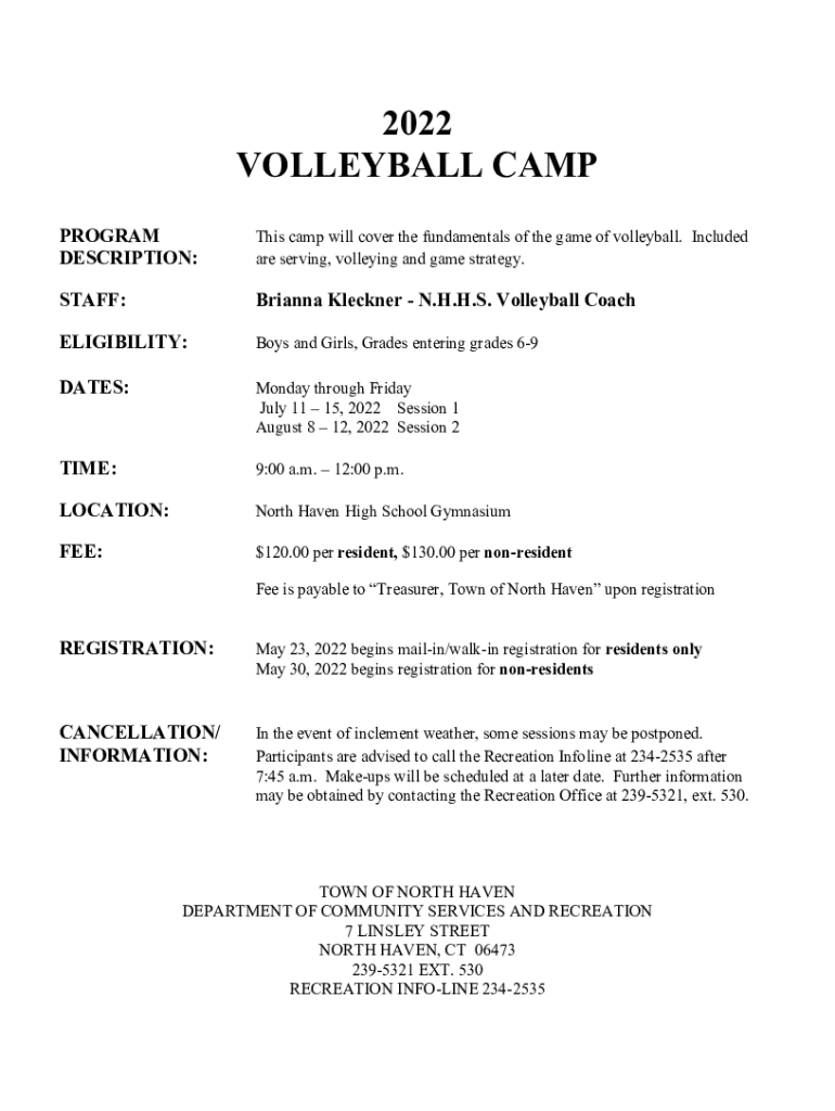 2022 VOLLEYBALL CAMP PROGRAM DESCRIPTION:This camp will cover the fundamentals of the game of volleyball. Included are serving, volleying and game strategy.STAFF:Brianna Cleaner N.H.H.S. Volleyball