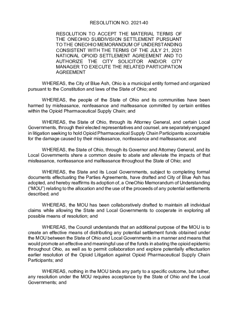RESOLUTION NO. 202140 RESOLUTION TO ACCEPT THE MATERIAL TERMS OF THE OHIO SUBDIVISION SETTLEMENT PURSUANT TO THE OHIO MEMORANDUM OF UNDERSTANDING CONSISTENT WITH THE TERMS OF THE JULY 21, 2021, NATIONAL