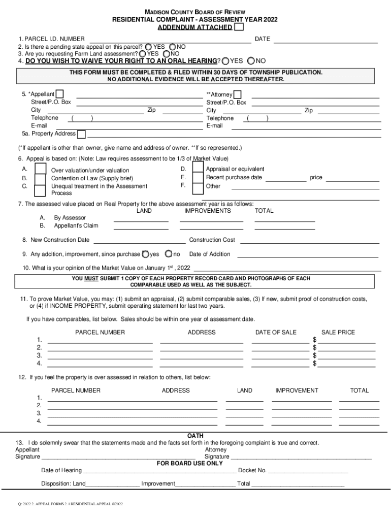 Thank you for visiting the Madison County Board of Review All appeals forms are a fillable PDF, so you can complete the forms on your computer. Per a change in the Board of Review Rules, electronic