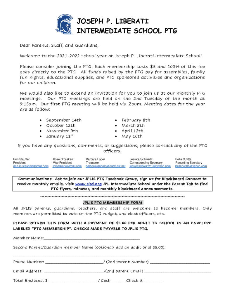 JOSEPH P. LIBERATE INTERMEDIATE SCHOOL PTG Dear Parents, Staff, and Guardians, Welcome to the 20212022 school year at Joseph P. Liberate Intermediate School! Please consider joining the PTG. Each