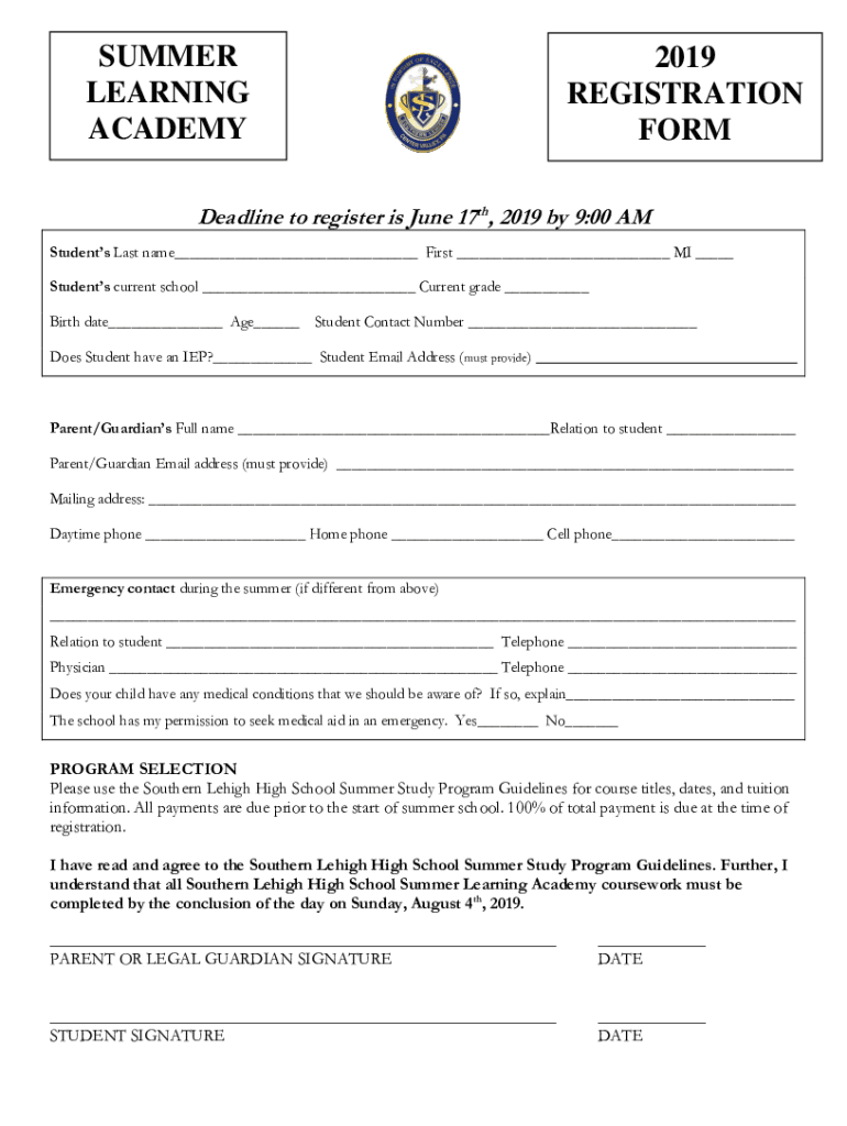 SUMMER LEARNING ACADEMY2019 REGISTRATION FORMDeadline to register is June 17th, 2019 by 9:00 AM Students Last name___ First ___ MI ___ Students current school ___ Current grade ___ Birth date___ Age___