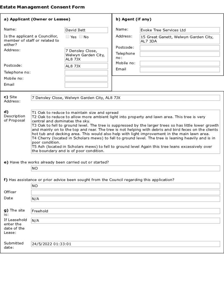 Estate Management Consent Form a) Applicant (Owner or Lessee)b) Agent (if any)Name:Name:Evoke Tree Services Address:15 Great Gannett, Welwyn Garden City, AL7 3DADavid Ileitis the applicant a Councillor,