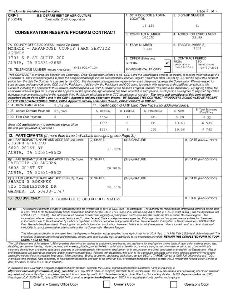 Page 1 of 2This form is available electronically. U.S. DEPARTMENT OF AGRICULTURE (102215) Commodity Credit Corporation1. ST. & CO CODE & ADMIN. LOCATIONCRP12. SIGN UP NUMBER19 135CONSERVATION RESERVE