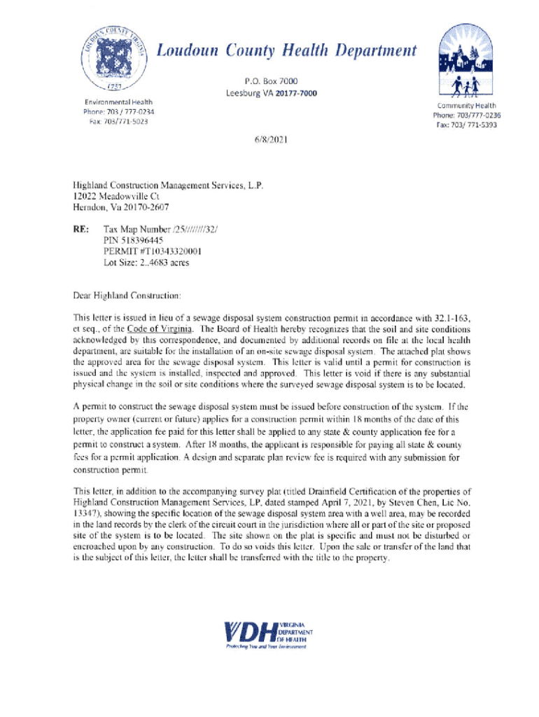P GONE,N5181 Letter OF TRANSMITTALHighwayWarrenton, VA 20187Ise\'em,540) 347 5500(800) 803 1320DATE: May 3, 2021FAX(540) 347 7870ATTENTION:Map# 518 39 6445RE:To: LoudounCountyHealth Department Lot