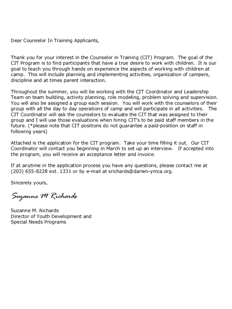 Dear Counselor In Training Applicants, Thank you for your interest in the Counselor in Training (CIT) Program. The goal of the CIT Program is to find participants that have a true desire to work with