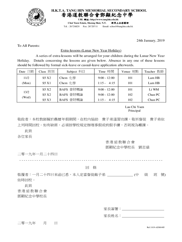 H.K.T.A. TANG IN MEMORIAL SECONDARY SCHOOL URL : http://www.tanghin.edu.hk Choir Yuan Estate, Cheung Shoo, N.T. Tel. 26726820Fax: 26720711Email: school@tanghin.edu.hk24th January 2019 To All Parents: