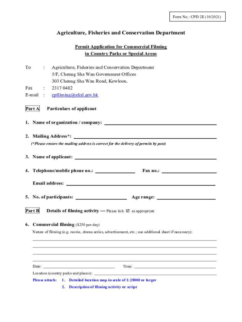 Form No.: CPD 2E (10/2021)Agriculture, Fisheries and Conservation Department Permit Application for Commercial Filming in Country Parks or Special Areas To:Fax : Email : Part Agriculture, Fisheries
