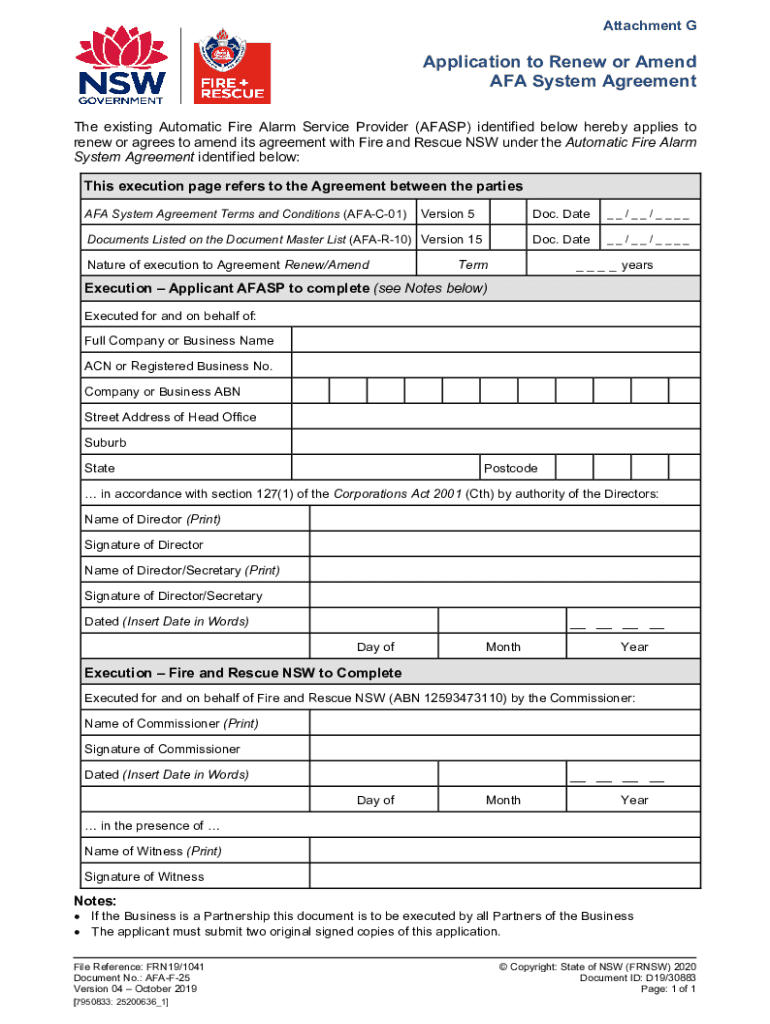 Attachment Application to Renew or Amend AFA System Agreement The existing Automatic Fire Alarm Service Provider (AF ASP) identified below hereby applies to renew or agrees to amend its agreement