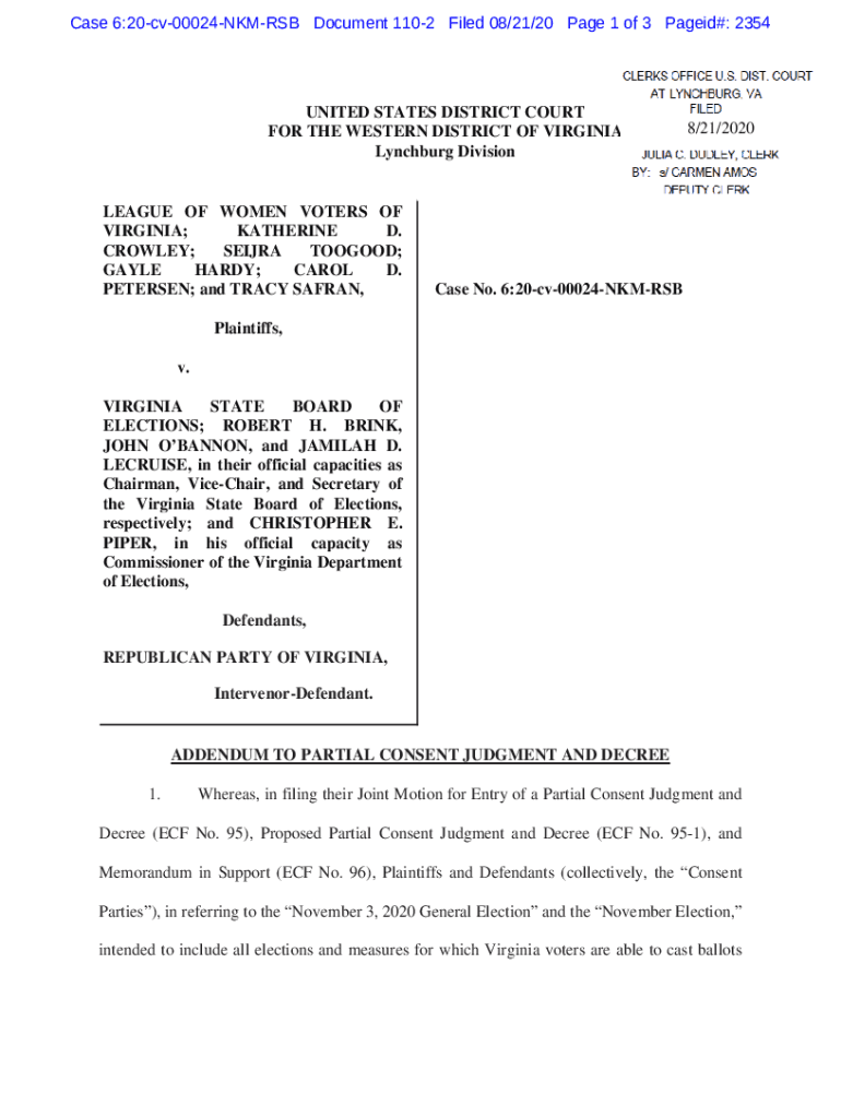 Case 6:20cv00024NKMRSB Document 1102 Filed 08/21/20-Page 1 of 3 Pagan#: 2354UNITED STATES DISTRICT COURT FOR THE WESTERN DISTRICT OF VIRGINIA Lynchburg DivisionLEAGUE OF WOMEN VOTERS OF VIRGINIA;