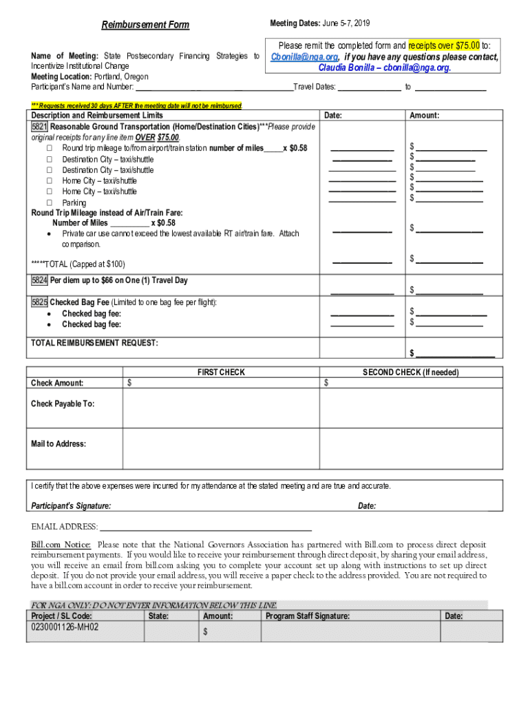 Meeting Dates: June 57, 2019Reimbursement Form Name of Meeting: State Postsecondary Financing Strategies to Incentivize Institutional Change Meeting Location: Portland, Oregon Participants Name and