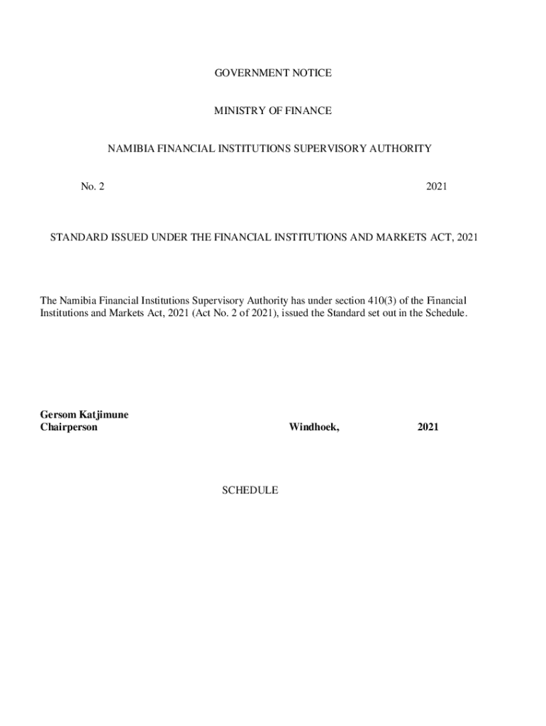 GOVERNMENT NOTICEMINISTRY OF FINANCENAMIBIA FINANCIAL INSTITUTIONS SUPERVISORY AUTHORITY No. 22021STANDARD ISSUED UNDER THE FINANCIAL INSTITUTIONS AND MARKETS ACT, 2021The Namibia Financial Institutions