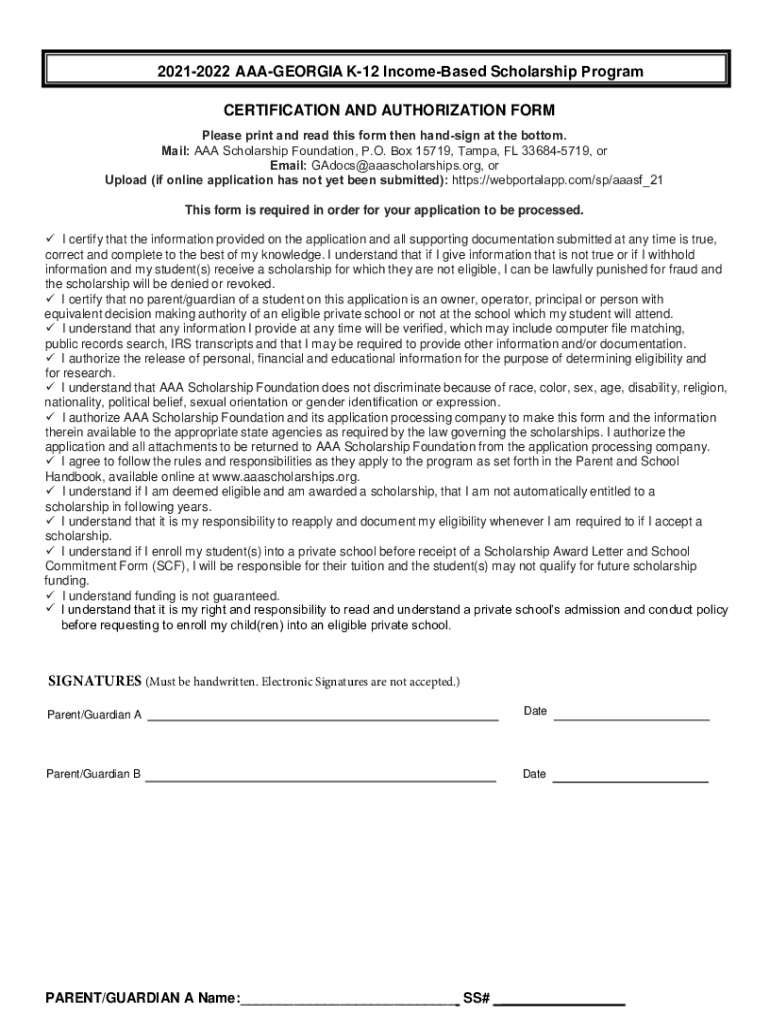 20212022 GEORGIA K12 Increased Scholarship Program CERTIFICATION AND AUTHORIZATION FORM Please print and read this form then hand sign at the bottom. Mail: AAA Scholarship Foundation, P.O. Box 15719,
