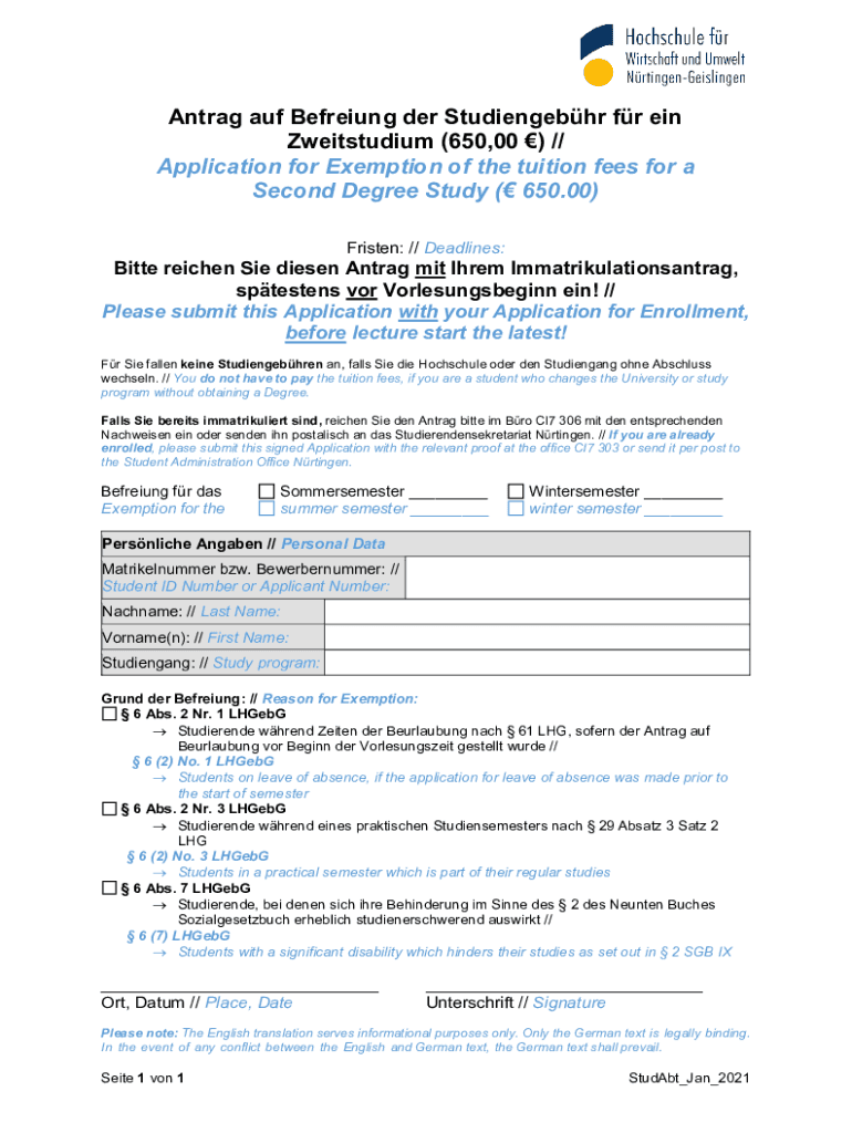 Get the free Application for Exemption of the tuition fees for a ... - HfWU