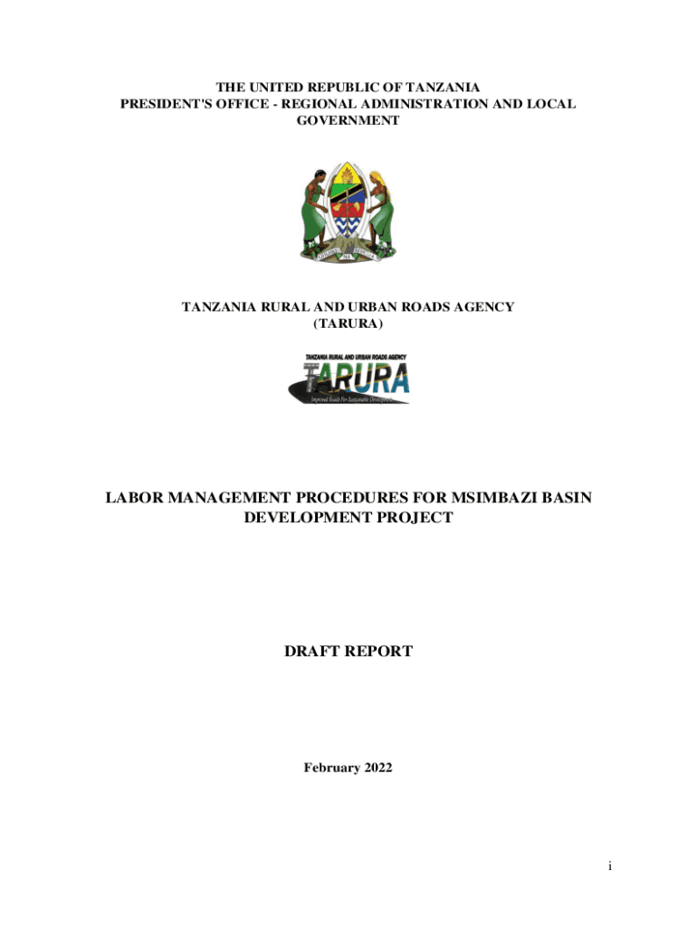 THE UNITED REPUBLIC OF TANZANIA PRESIDENT\'S OFFICE REGIONAL ADMINISTRATION AND LOCAL GOVERNMENTTANZANIA RURAL AND URBAN ROADS AGENCY (TAR URA)LABOR MANAGEMENT PROCEDURES FOR MUMBAI BASIN DEVELOPMENT