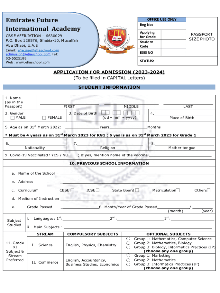 Emirates Future International AcademyOFFICE USE ONLY Reg No: Applying for Grade Student Code CBSE AFFILIATION 6630029 P.O. Box 128576, Shabia10, Mustafa Abu Dhabi, U.A.E. Email: efia.uae@efiaschool.com