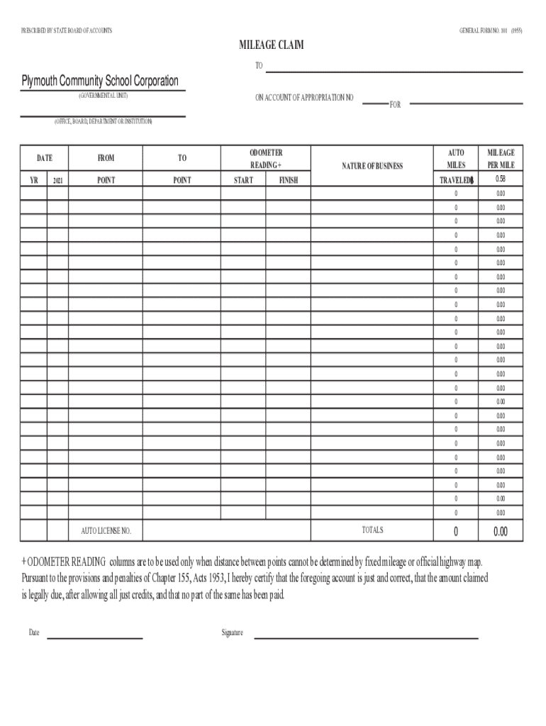 PRESCRIBED BY STATE BOARD OF ACCOUNTSGENERAL FORM NO. 101MILEAGE CLAIM(1955)TO Plymouth Community School Corporation ON ACCOUNT OF APPROPRIATION NO(GOVERNMENTAL UNIT)FOR(OFFICE, BOARD, DEPARTMENT