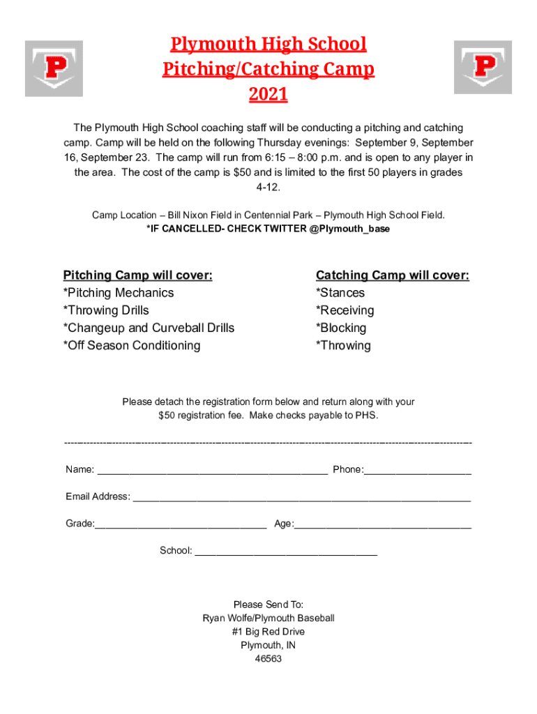 Plymouth High School Pitching/Catching Camp 2021 The Plymouth High School coaching staff will be conducting a pitching and catching camp. Camp will be held on the following Thursday evenings: September