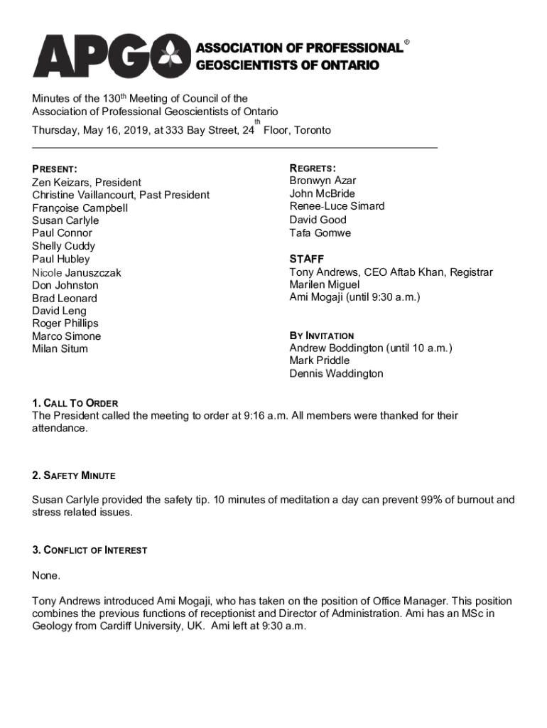 Minutes of the 130th Meeting of Council of the Association of Professional Geoscientists of Ontario Thursday, May 16, 2019, at 333 Bay Street, 24 Floor, Toronto ___ PRESENT: Zen Ears, President Christine