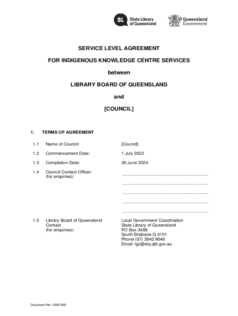 SERVICE LEVEL AGREEMENT FOR INDIGENOUS KNOWLEDGE Center SERVICES between LIBRARY BOARD OF QUEENSLAND and [COUNCIL]1.TERMS OF AGREEMENT1.1Name of Council:[Council]1.2Commencement Date:1 July 20221.3Completion