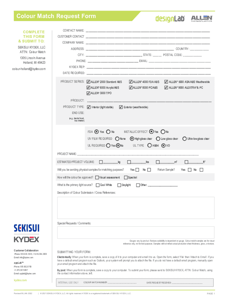Color Match Request Form COMPLETE THIS FORM & SUBMIT TO: SERIOUS INDEX, LLC ATTN: Color Match 1305 Lincoln Avenue Holland, MI 49423 colourholland@kydex.comCONTACT NAME: ___ CUSTOMER CONTACT ___ COMPANY