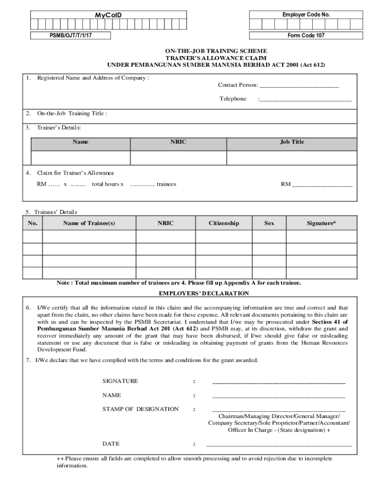 MyCoIDEmployer Code No.PSMB/OJT/T/1/17Form Code 107 ONTHEJOB TRAINING SCHEME TRAINERS ALLOWANCE CLAIM UNDER PEMBANGUNAN NUMBER MAN USIA BROAD ACT 2001 (Act 612)1. Registered Name and Address of Company