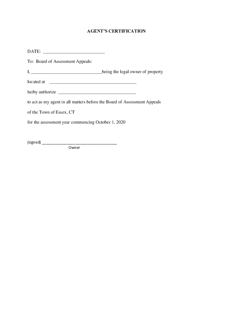 AGENTS CERTIFICATIONDATE: ___ To: Board of Assessment Appeals: I, ___being the legal owner of property located at___herby authorize ___ to act as my agent in all matters before the Board of Assessment