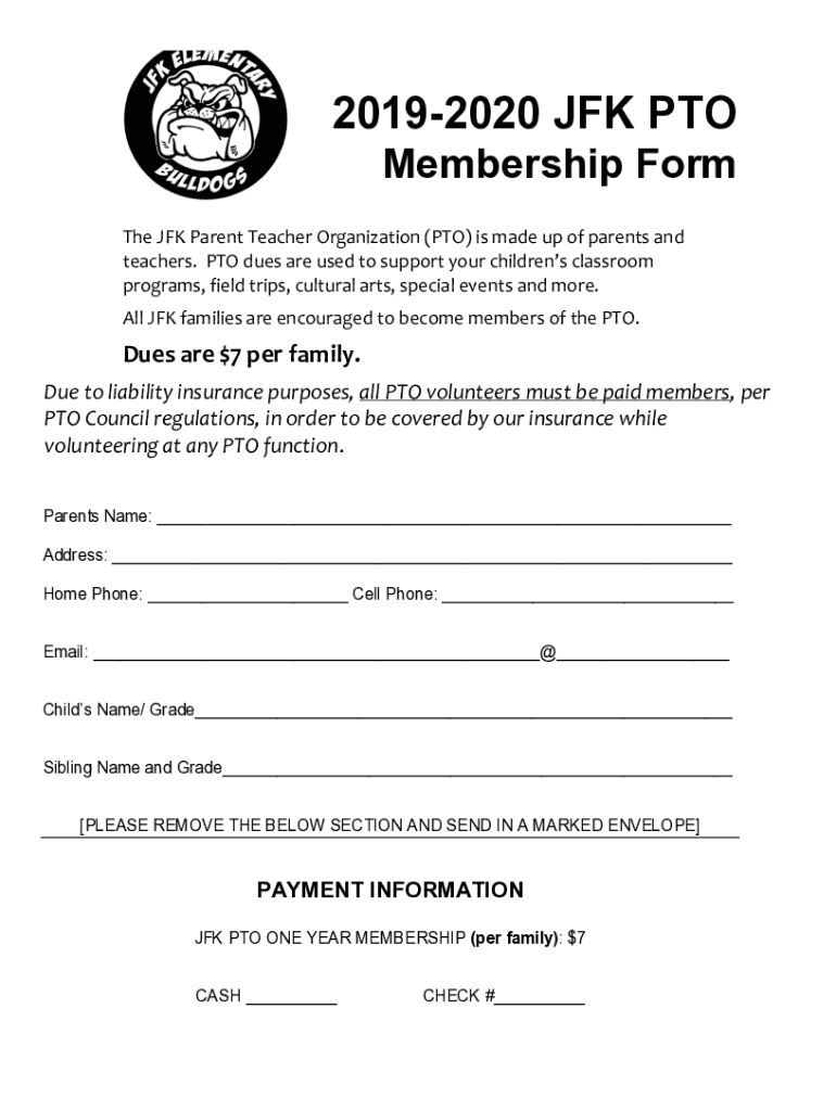 20192020 JFK PTO Membership Form The JFK Parent Teacher Organization (PTO) is made up of parents and teachers. PTO dues are used to support your children's classroom programs, field trips, cultural