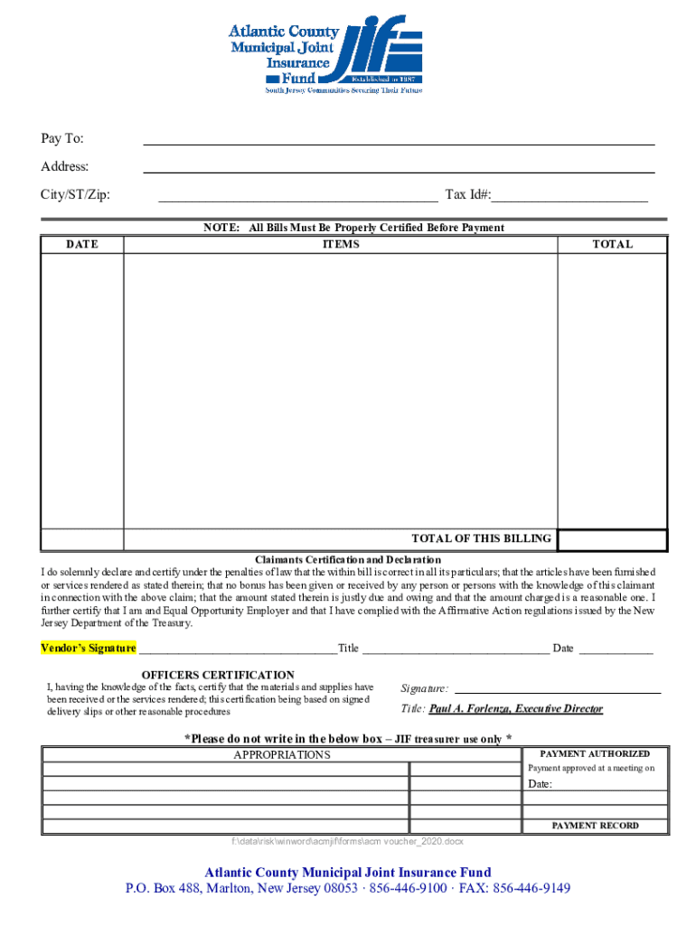 Pay To: Address: City/ST/Zip: DATE___ Tax I'd#:___ NOTE: All Bills Must Be Properly Certified Before Payment ITEMSTOTALTOTAL OF THIS BILLING Claimants Certification and Declaration I do solemnly declare