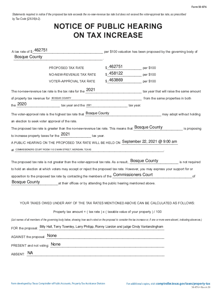Form 50876Statements required in notice if the proposed tax rate exceeds the nonewrevenue tax rate but does not exceed the voter approval tax rate, as prescribed by Tax Code 26.06(b2).NOTICE OF PUBLIC