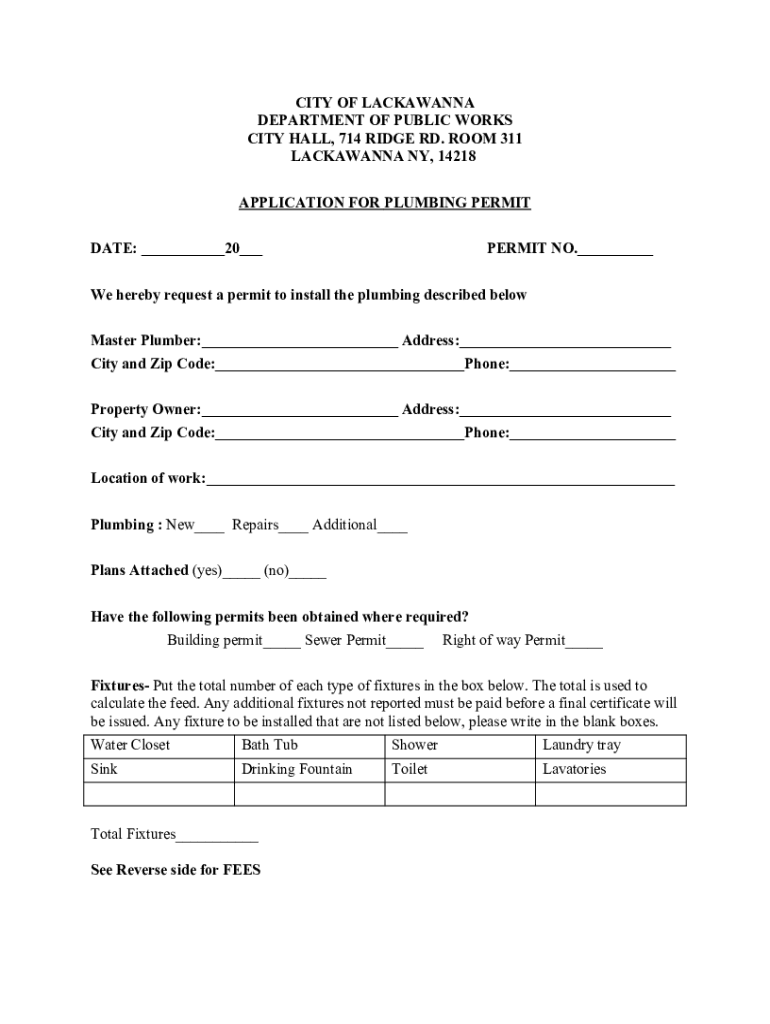CITY OF LACKAWANNA DEPARTMENT OF PUBLIC WORKS CITY HALL, 714 Ridges RD. ROOM 311 LACKAWANNA NY, 14218 APPLICATION FOR PLUMBING PERMIT DATE: ___20___PERMIT NO.___We hereby request a permit to install