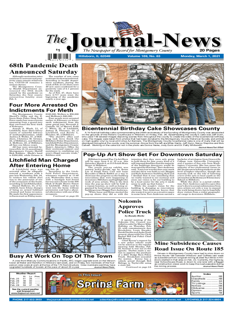 OurnalNews JThe$120 Pages Newspaper of Record for Montgomery CountyHillsboro, IL 62049Volume 169, No. 83Monday, March 1, 202168th Pandemic Death Announced Saturday Although vaccination rates continue