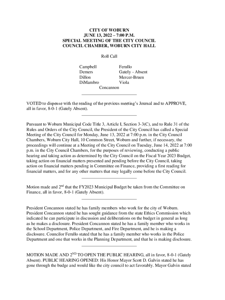 CITY OF WOBURN JUNE 13, 2022 7:00 P.M. SPECIAL MEETING OF THE CITY COUNCIL CHAMBER, WOBURN CITY HALL Roll Call Campbell Defers Dillon DiMambroFerullo Lately Absent MercerBruen Viola Concannon ___VOTED