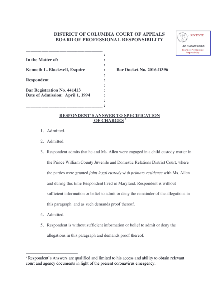 DISTRICT OF COLUMBIA COURT OF APPEALS BOARD OF PROFESSIONAL RESPONSIBILITY Jun 15 2020 9:25am___ : In the Matter of: : : Kenneth L. Blackwell, Esquire : : Respondent : : Bar Registration No. 441413
