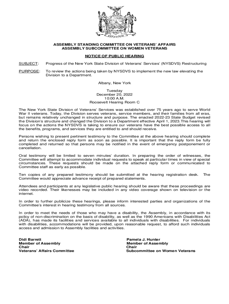 ASSEMBLY STANDING COMMITTEE ON VETERANS AFFAIRS ASSEMBLY SUBCOMMITTEE ON WOMEN VETERANS NOTICE OF PUBLIC HEARING SUBJECT:Progress of the New York State Division of Veterans Services (NEEDS) RestructuringPURPOSE:To