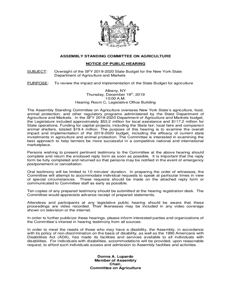 ASSEMBLY STANDING COMMITTEE ON AGRICULTURE NOTICE OF PUBLIC HEARING SUBJECT:Oversight of the SAY 20192020 State Budget for the New York State Department of Agriculture and MarketsPURPOSE:To review