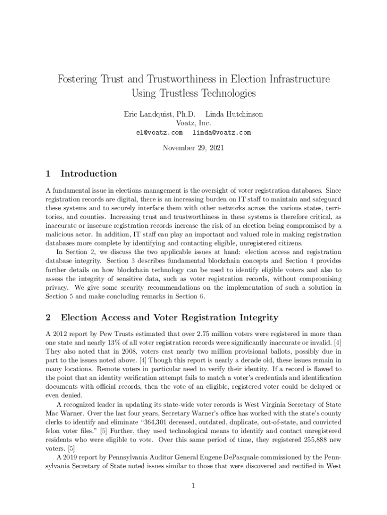 Fostering Trust and Trustworthiness in Election Infrastructure Using Trustless Technologies Eric Lundquist, Ph.D. Linda Hutchinson Vote, Inc. el@voatz.com linda@voatz.com November 29, 20211IntroductionA