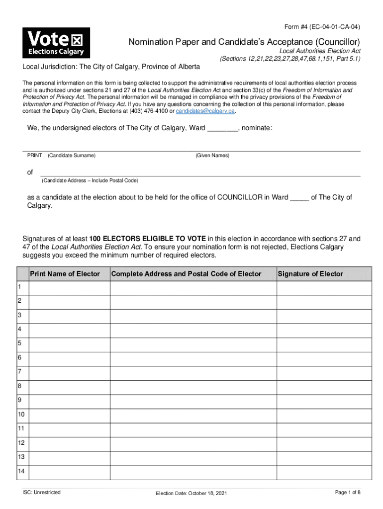Form #4 (EC0401CA04)Nomination Paper and Candidates Acceptance (Councillor) Local Authorities Election Act (Sections 12,21,22,23,27,28,47,68.1,151, Part 5.1)Local Jurisdiction: The City of Calgary,