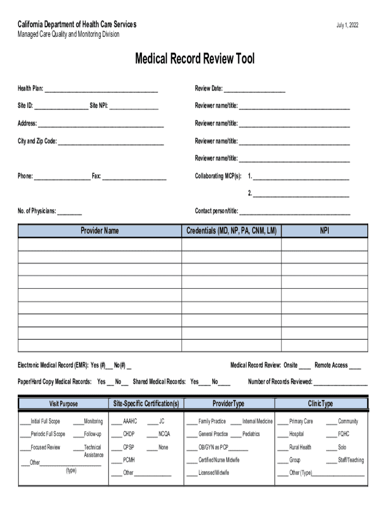 California Department of Health Care Services July 1, 2022Managed Care Quality and Monitoring DivisionMedical Record Review Tool Health Plan: ___Review Date: ___Site ID: ___ Site NPI: ___Reviewer