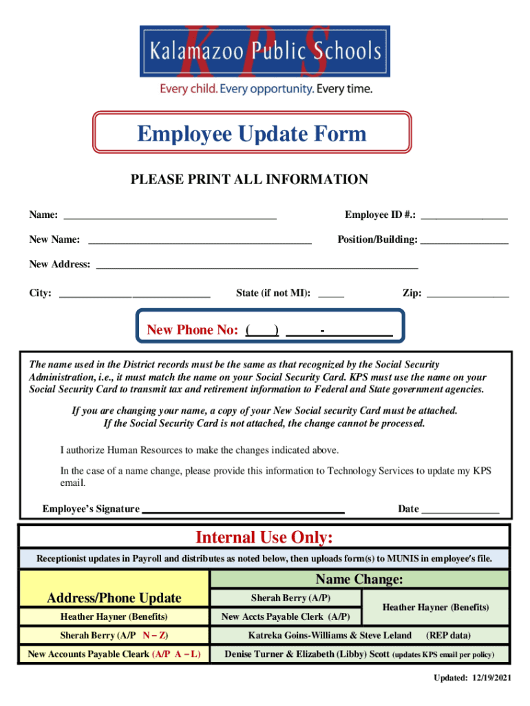 Employee Update Form PLEASE PRINT ALL INFORMATION Name: ___Employee ID #.: ___New Name: ___Position/Building: ___New Address: ___ City: ___State (if not MI): ___New Phone No: ()Zip: ___The name used