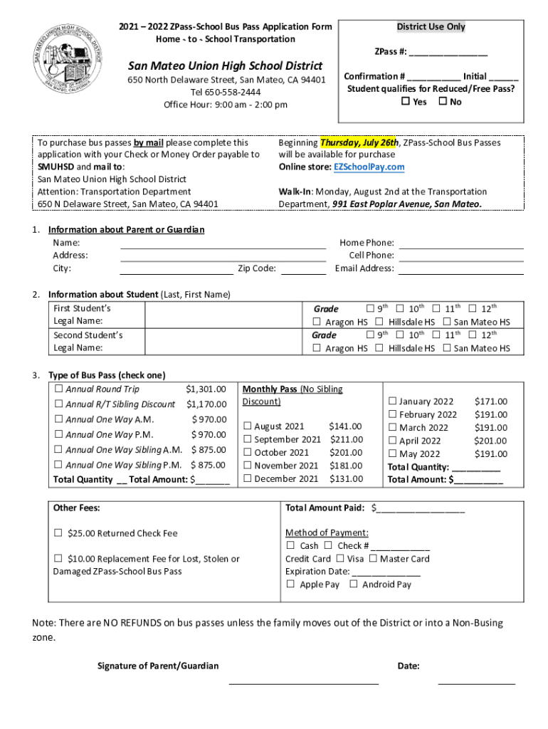 Get the free Bus Pass Applications - San Mateo Union High School District