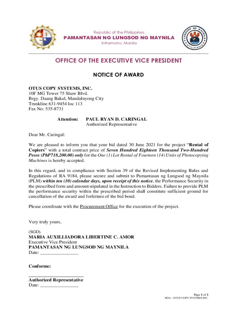 Republic of the PhilippinesPAMANTASAN NG LUNG SOD NG MANILA Intramural, ManilaOFFICE OF THE EXECUTIVE VICE PRESIDENT NOTICE OF AWARD OTIS COPY SYSTEMS, INC. 10F MG Tower 75 Shaw Blvd. Bray. Dang Basal,