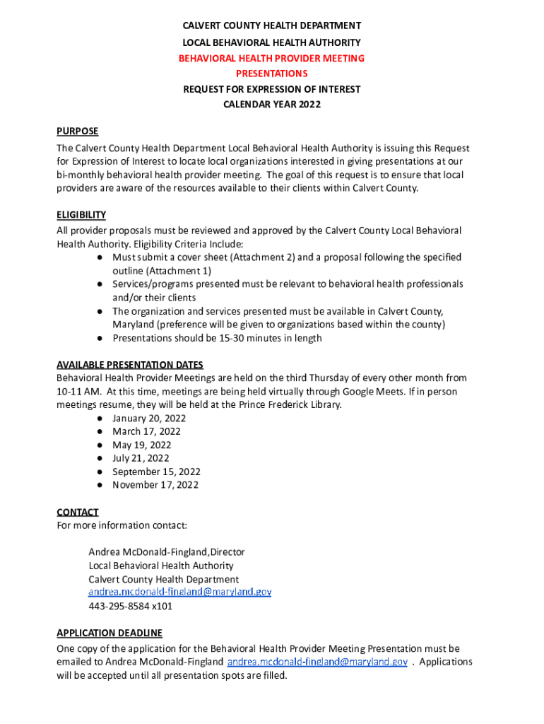 CALVERT COUNTY HEALTH DEPARTMENT LOCAL BEHAVIORAL HEALTH AUTHORITY BEHAVIORAL HEALTH PROVIDER MEETING PRESENTATIONS REQUEST FOR EXPRESSION OF INTEREST CALENDAR YEAR 2022 PURPOSE The Calvert County