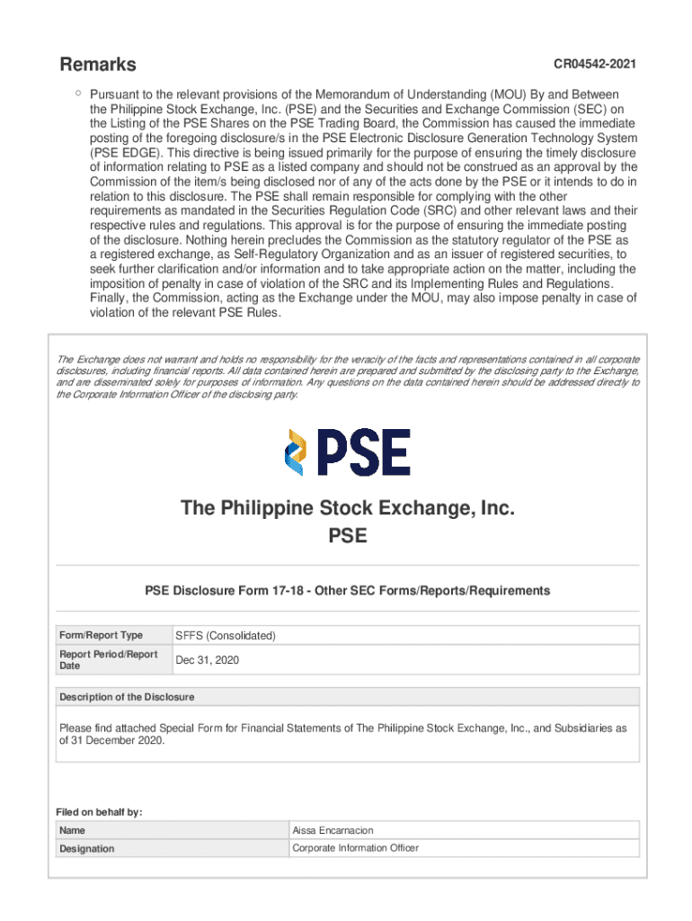 RemarksCR045422021Pursuant to the relevant provisions of the Memorandum of Understanding (YOU) By and Between the Philippine Stock Exchange, Inc. (PSE) and the Securities and Exchange Commission (SEC)