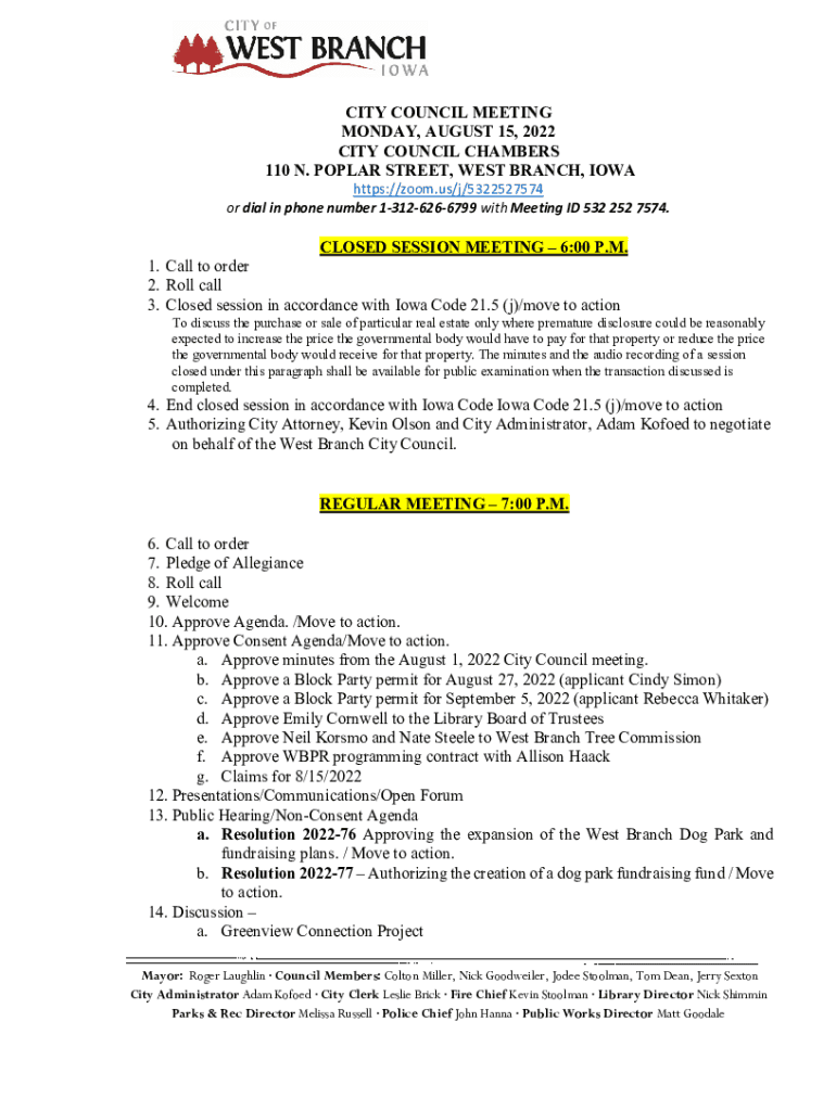 CITY COUNCIL MEETING MONDAY, AUGUST 15, 2022, CITY COUNCIL CHAMBERS 110 N. POPLAR STREET, WEST BRANCH, IOWAhttps://zoom.us/j/5322527574 or dial in phone number 13126266799 with Meeting ID 532 252