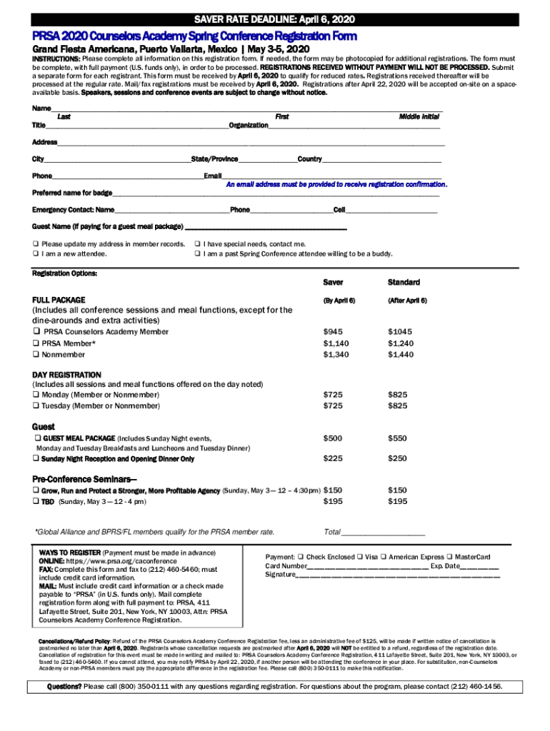 SAVER RATE DEADLINE: April 6, 2020PRSA 2020 Counselors Academy Spring Conference Registration Form Grand Fiesta Americana, Puerto Vallarta, Mexico | May 35, 2020, INSTRUCTIONS: Please complete all